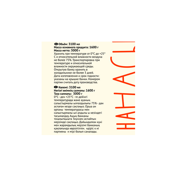 годен 3 года при соблюдении условий хранения. Хранить при температуре от 0 до 25 °C и относительной влажности не более 75 %. После вскрытия продукт переложить в другую неметаллическую посуду и хранить от +2 до +6 °C, употребить в течении трех дней