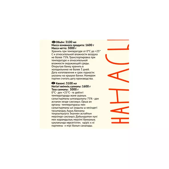 хранить при температуре от 0 до +25 °C и относительной влажности не более 75 %. После вскрытия продукт переложить в другую неметаллическую посуду и хранить от +2 до +6 °C, употребить в течении трех дней.