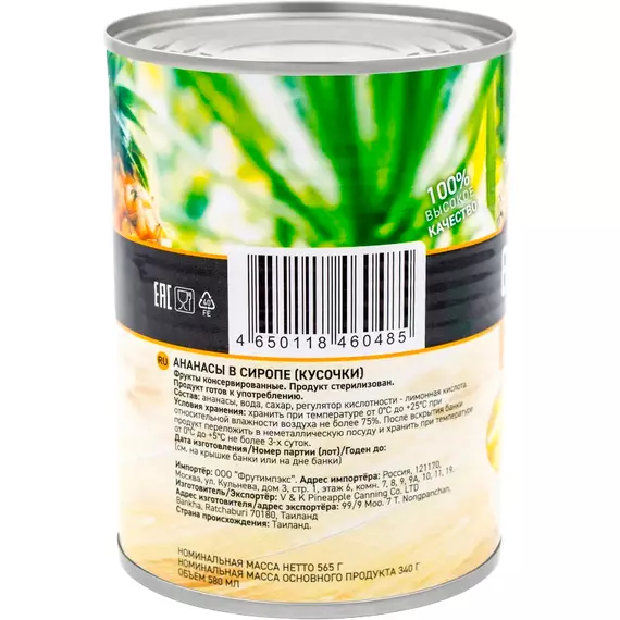 кусочки ананаса, вода, сахар, регулятор кислотности: лимонная кислота