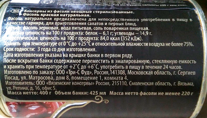 фасоль зерновая, вода питьевая, соль пищевая повареная