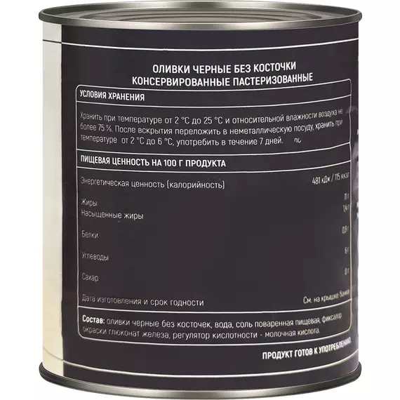 Оливки, вода, соль, молочная кислота (E270), глюконат железа (E579). Стерилизованный продукт.
