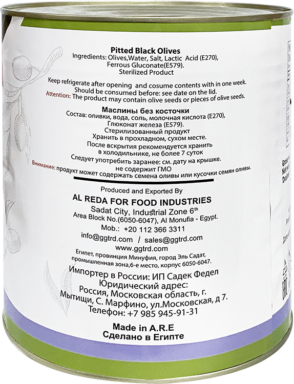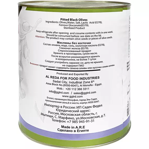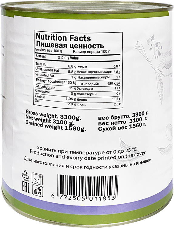 Оливки, вода, соль, молочная кислота (E270), глюконат железа (E579). Стерилизованный продукт.