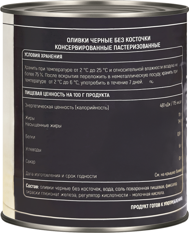 Оливки, вода, соль, молочная кислота (E270), глюконат железа (E579). Стерилизованный продукт.