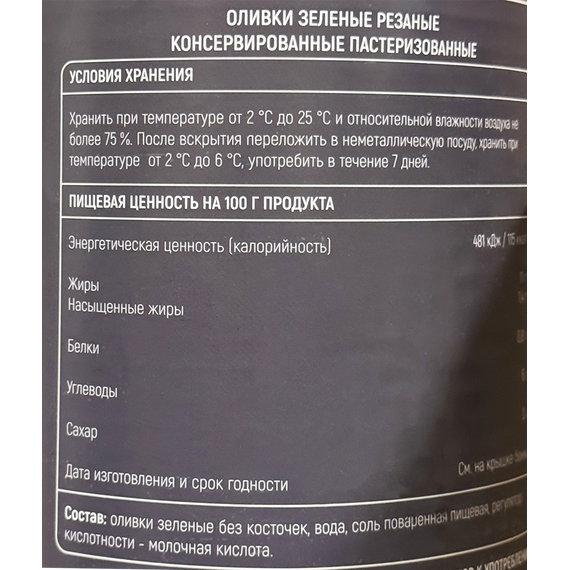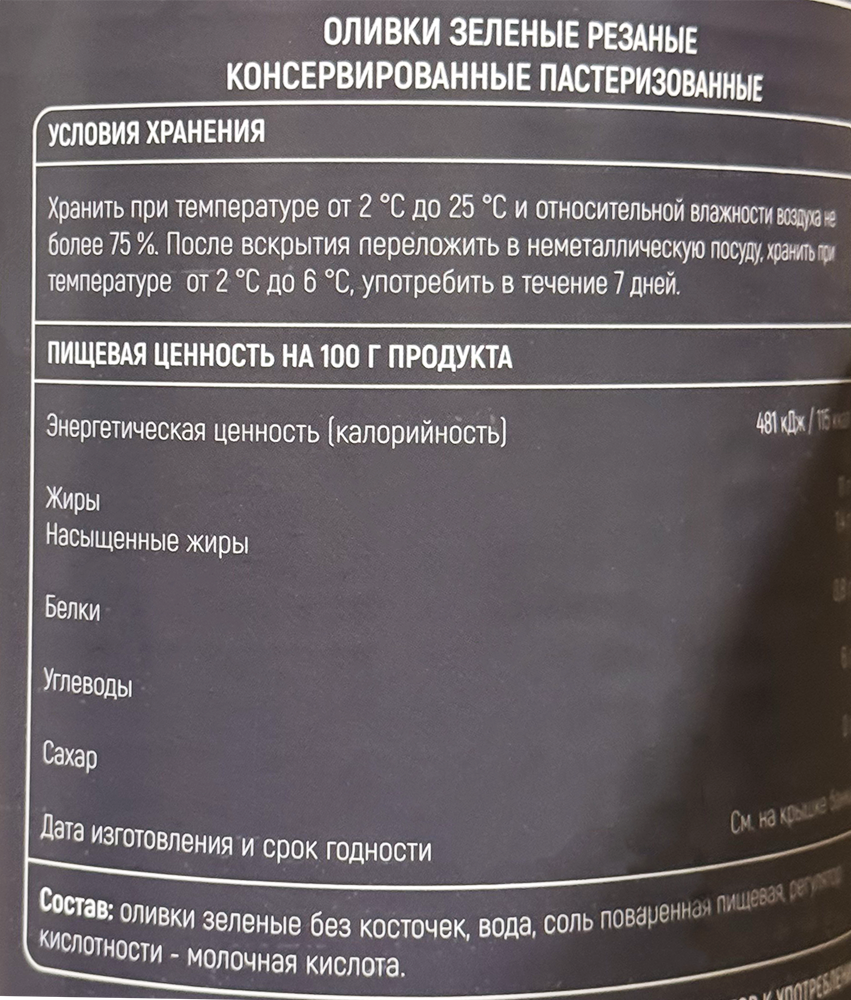 Оливки, вода, соль, молочная кислота (E270), глюконат железа (E579). Стерилизованный продукт.