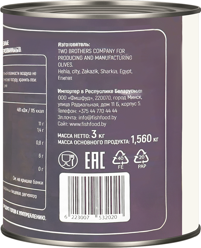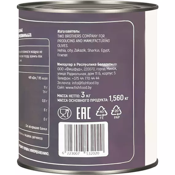 Маслины резаные Fish&Food - это отборные зрелые плоды масличного дерева, выращенные под солнцем Египта и упакованные в металлическую банку объемом 3,1 литра (вес нетто 1,56 кг).