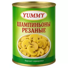 Резаные шампиньоны Yummy — готовые к использованию грибы в большой жестяной банке. Удобно, выгодно и идеально для кухни HoReCa и дома.