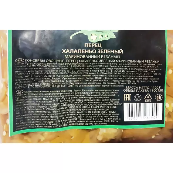 Перец Халапеньо маринованный, резаный Бояринъ, пакет 1100 мл/900 г