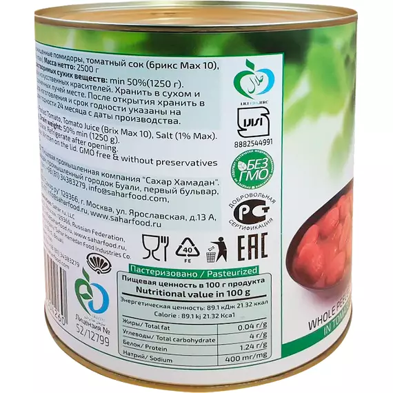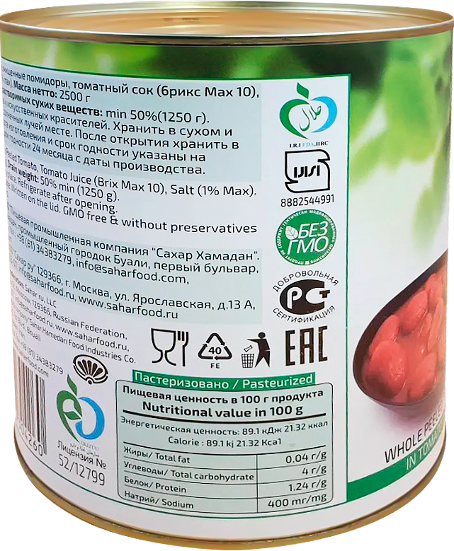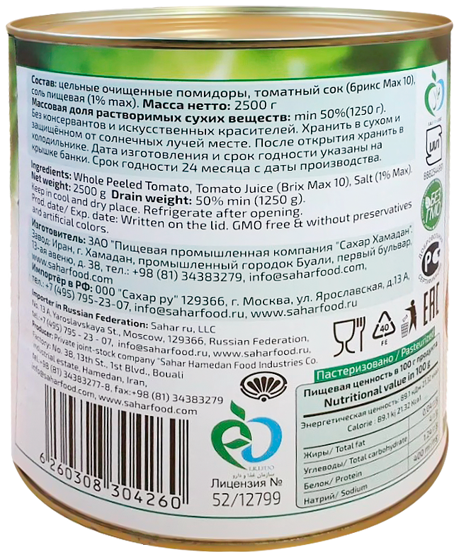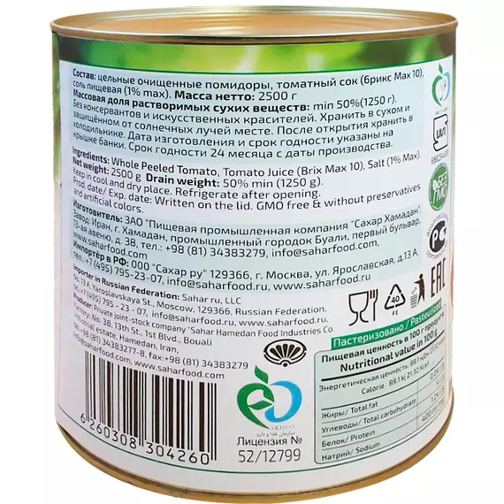 Томаты очищенные целые в собственном соку 2500 мл/1250 г Sahar Иран