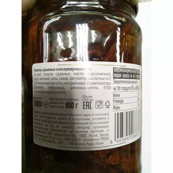 Томаты сушеные в масле ''И.П.О.С.Е.А.'', 1,6кг/1,7л/0,8 кг, стеклянная банка