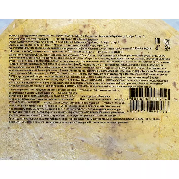Тортилья 10 дюймов Ø25 см с сыром замороженная пачка 12 шт Черёмушки
