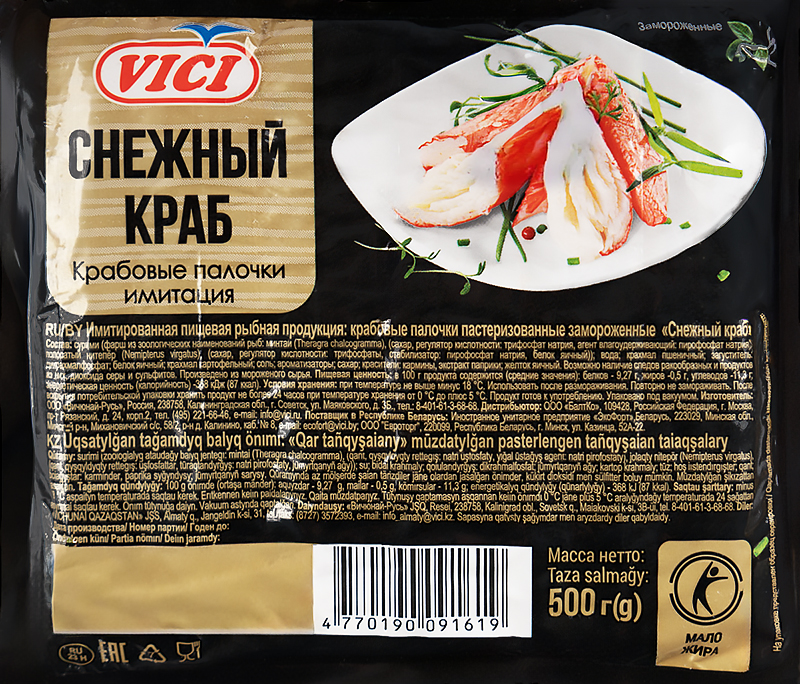 Крабовые палочки «Снежный краб» VICI — качественный замороженный продукт, изготовленный на основе сурими с нежной слоистой текстурой и приятным вкусом. Отличаются стабильным качеством, аккуратной формой и хорошей нарезаемостью.