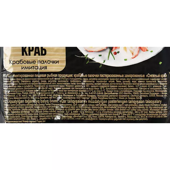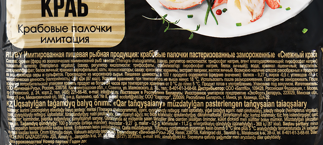 Сурими (фарш из зоологических наименований рыб: минтай, (сахар, регулятор кислотности: трифосфат натрия, агент влагоудерживающий: пирофосфат натрия, полосатый нитепер), (сахар, регулятор кислотности: трифосфаты, стабилизатор: трифосфат натрия, белок яичный)); вода, крахмал пшеничный, загуститель, белок яичный, крахмал картофельный, соль, ароматизаторы, сахар, красители: кармины, экстракт паприки, желток яичный.
