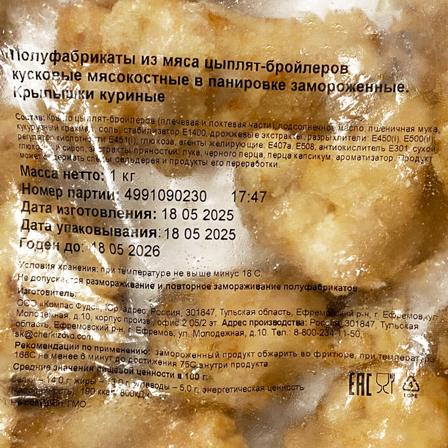 Куриные крылья неострые в панировке Компас Фудс 1 кг, замороженные