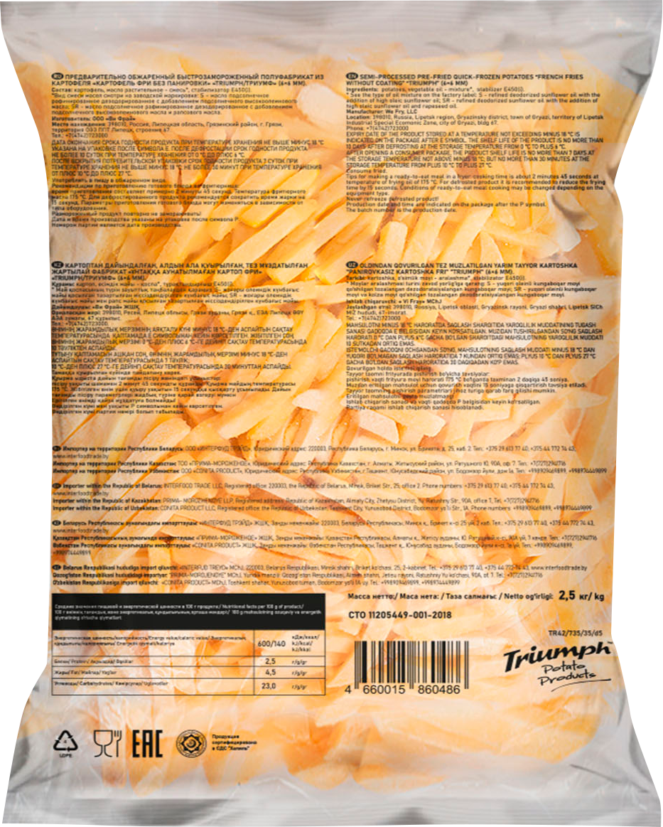 Картофель фри «Триумф» — отличный выбор для кафе, ресторанов, фастфуда, а также для домашнего приготовления. Он сохраняет естественный вкус свежего картофеля и хрустящую текстуру после жарки.