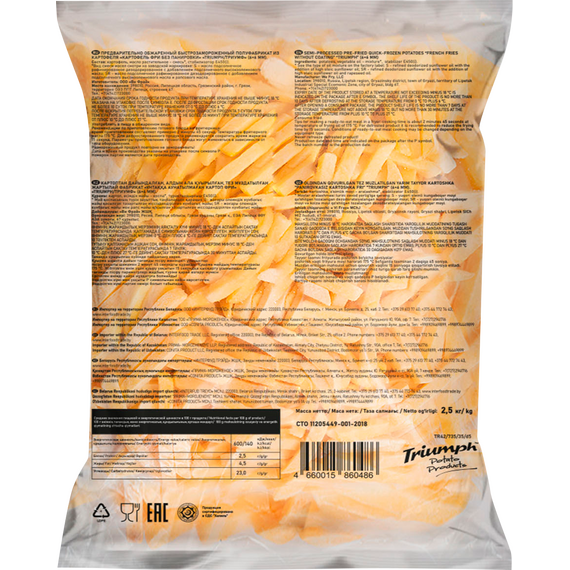 Картофель фри Триумф 6/6 замороженный, 2,5 кг — это качественный полуфабрикат из отборного картофеля, созданный для быстрого и удобного приготовления. Идеально ровные полоски картофеля размером 6×6 мм обеспечивают равномерное обжаривание и аппетитную золотистую корочку.