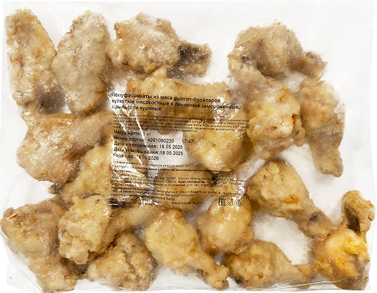 крыло цыплят бройлеров (локтевая и плечевая части), подсолнечное масло, пшеничная мука, кукурузный крахмал, соль, стабилизатор У1400, дрожжевые экстракты, разрыхлители: E450i, E500ii; регулятор кислотности E451i, глюкоза, агенты желирующие E407a, E508; антиокислитель Е301, глюкозы сироп, экстракты пряностей: лука, черного перца, перца капскиум; ароматизатор. Продукт может содержать следы сельдерея следы его переработки.