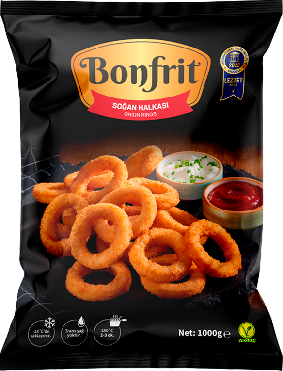 Кольца луковые в панировке Bonfrit станут отличным дополнением к пивной тарелке или же можно употреблять как самостоятельное блюдо. Кольца достаточно сытные, поэтому рекомендуется умеренный прием.