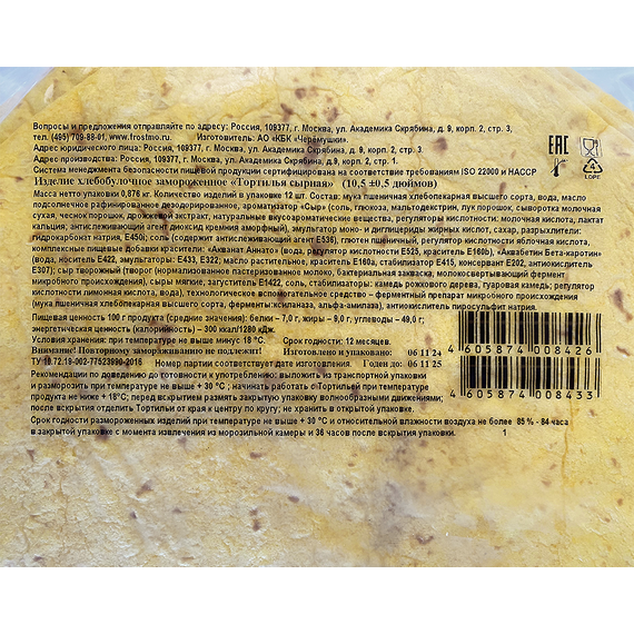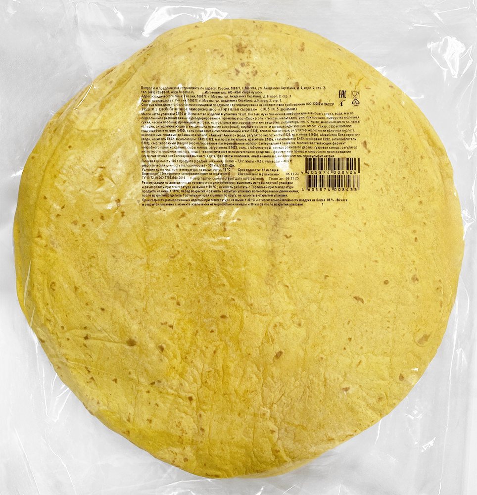 Пшеничная сырная лепешка для приготовления буритто, кесадильи, энчиладос или сытных рулетов и других закусок. Для придания румяной, хрустящей корочки тортилью можно поджарить на сковороде в течении 1-2 минут.