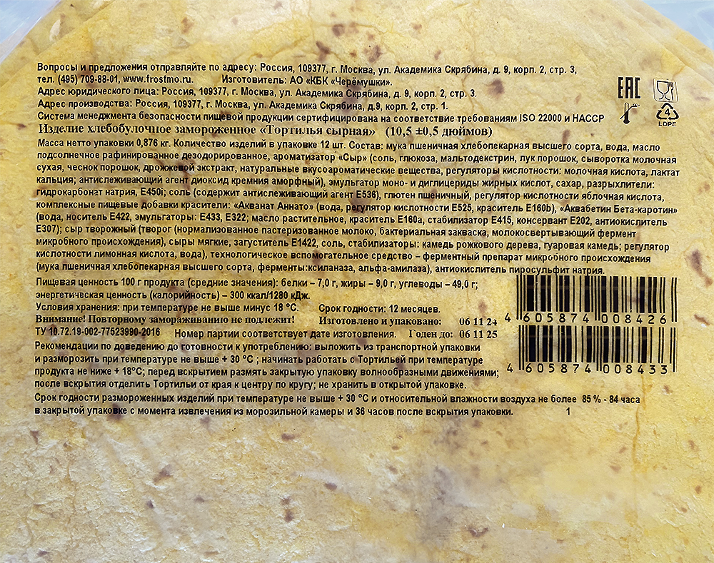Тортилья 10 дюймов Ø25 см с сыром замороженная пачка 12 шт Черёмушки