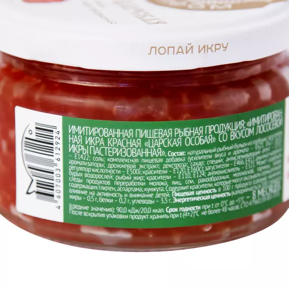 Икра имитированная "Царская" производится на основе полезного для здоровья экстракта морских водорослей, с добавлением рыбного бульона из филе горбуши, богатого натуральным рыбьим жиром (Омега-3).