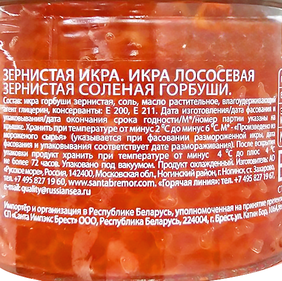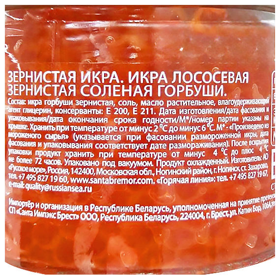 икра горбуши зернистая, соль, масло растительное, влагоудерживающий агент глицерин, консерванты: E200, E211.