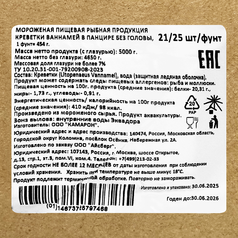 Крупные, сочные, без головы и с минимальной глазурью (всего 7%) — вы получаете 4,65 кг чистого продукта из каждой коробки.