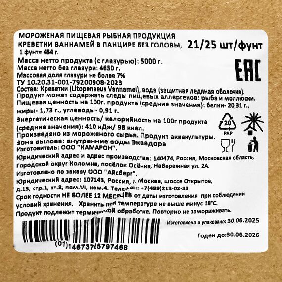 Массовая доля глазури - не более 7%, что гарантирует честный вес продукта. Из 5 кг нетто - 4,65 кг чистого продукта без глазури.