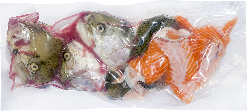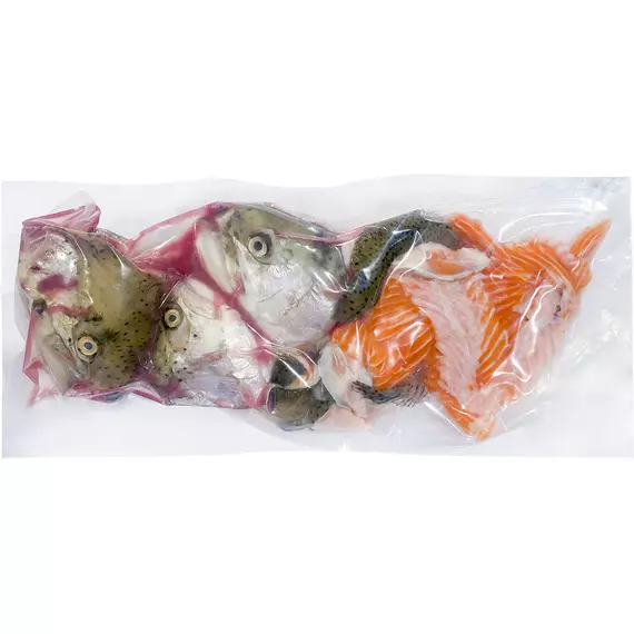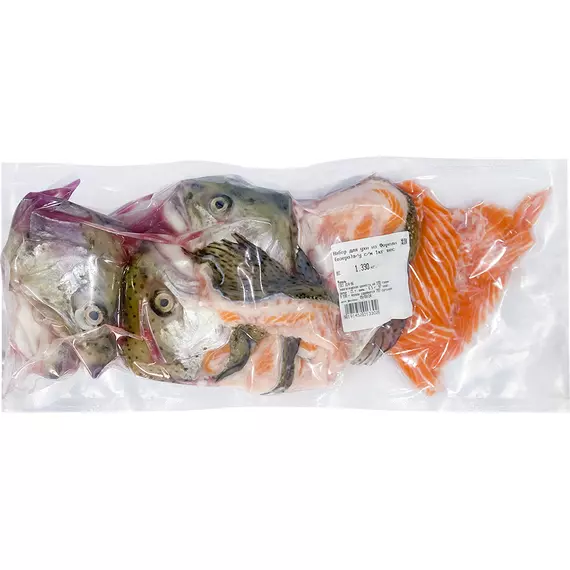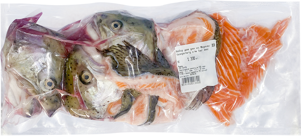 В набор для ухи входят головы с приголовками, наросты с хвостовыми плавниками, плечевые кости с прорезями мяса, плавники с прорезями мяса, реберные кости с прорезями мяса, получаемые при разделке рыбы.