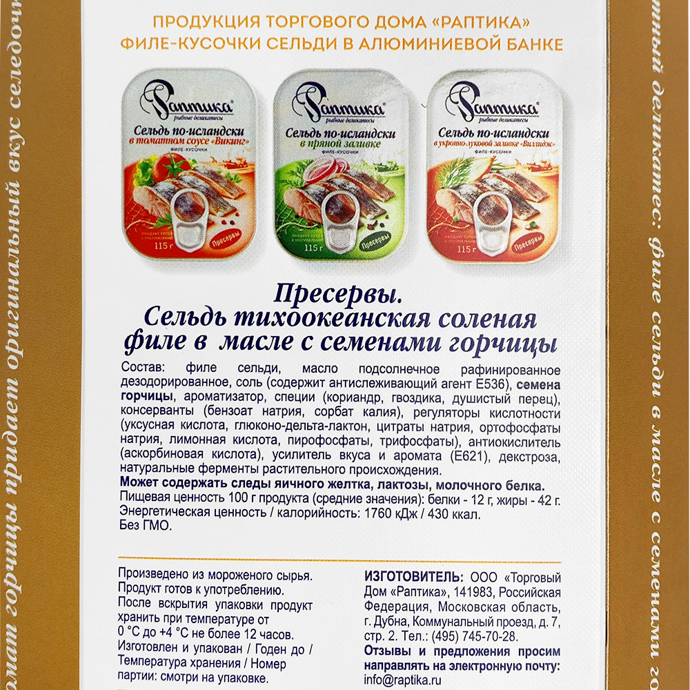 Филе сельди, масло подсолнечное рафинированное дезодорированное, соль (содержит антислеживающий агент Е536), семена горчицы, специи (кориандр, гвоздика, душистый перец), консерванты (бензоат натрия, сорбиновая кислота), регуляторы кислотности (уксусная кислота, глюконо-дельта-лактон, цитраты натрия, ортофосфаты натрия, лимонная кислота, пирофосфаты, трифосфаты), антиокислитель (аскорбиновая кислота), усилитель вкуса и аромата (E621), декстроза, натуральные ферменты растительного происхождения.