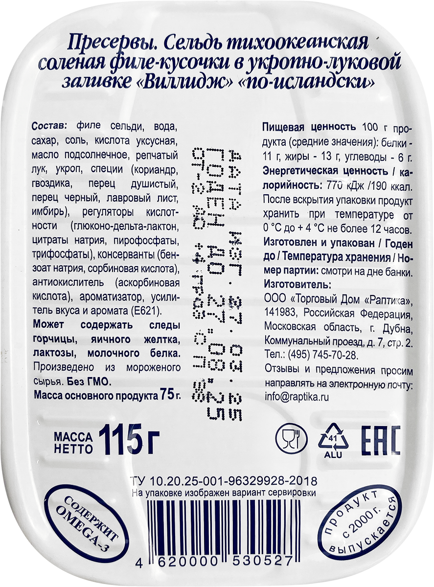 Сельдь Раптика По-исландски Виллидж в луково-укропной заливке 115г