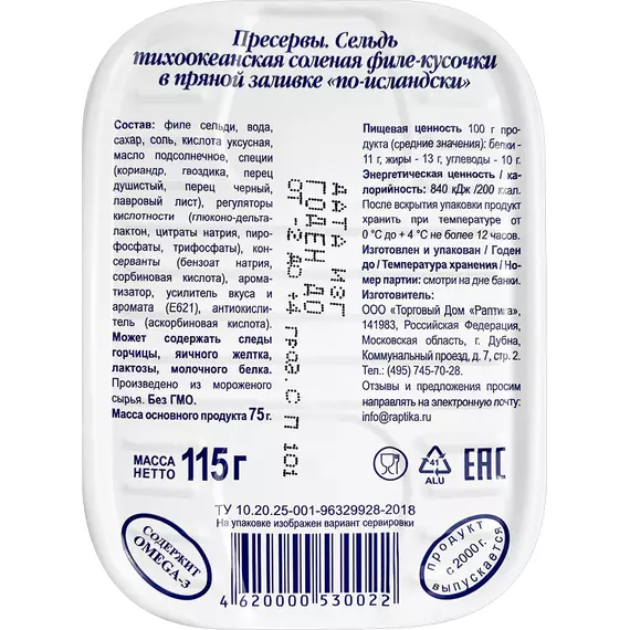 Сельдь Раптика По-исландски в пряной заливке 115г