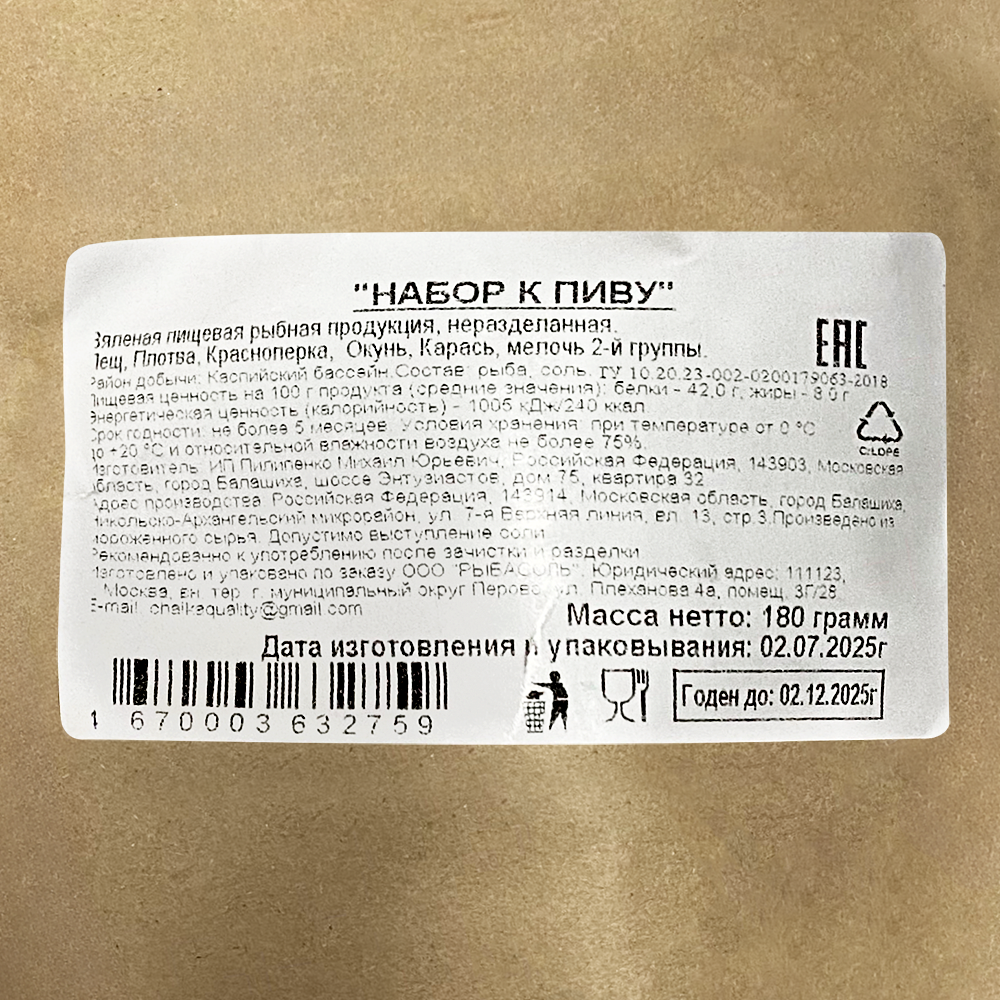 В составе набора лещ, плотва, окунь, карась, красноперка. Район добычи - Каспийский бассейн.