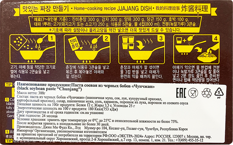 паста из черных бобов "Чунчжан" (пшеничная мука, соя, лук, кукурузный крахмал, картофельный крахмал), сахар, пшеничная мука, соль, карамель, порошок из лука, порошок из соевого соуса