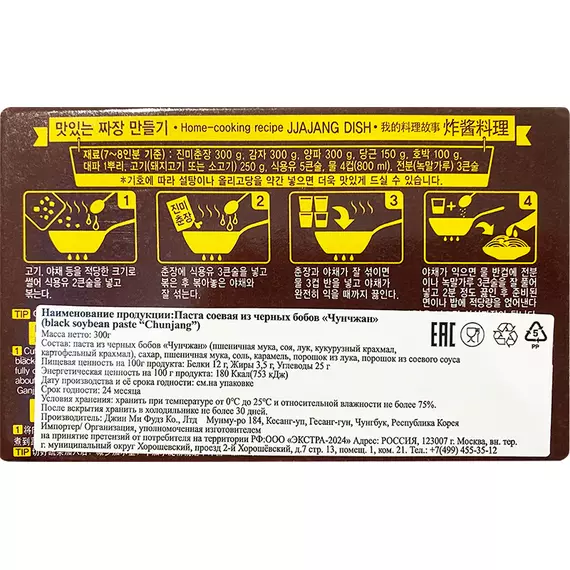 паста из черных бобов "Чунчжан" (пшеничная мука, соя, лук, кукурузный крахмал, картофельный крахмал), сахар, пшеничная мука, соль, карамель, порошок из лука, порошок из соевого соуса
