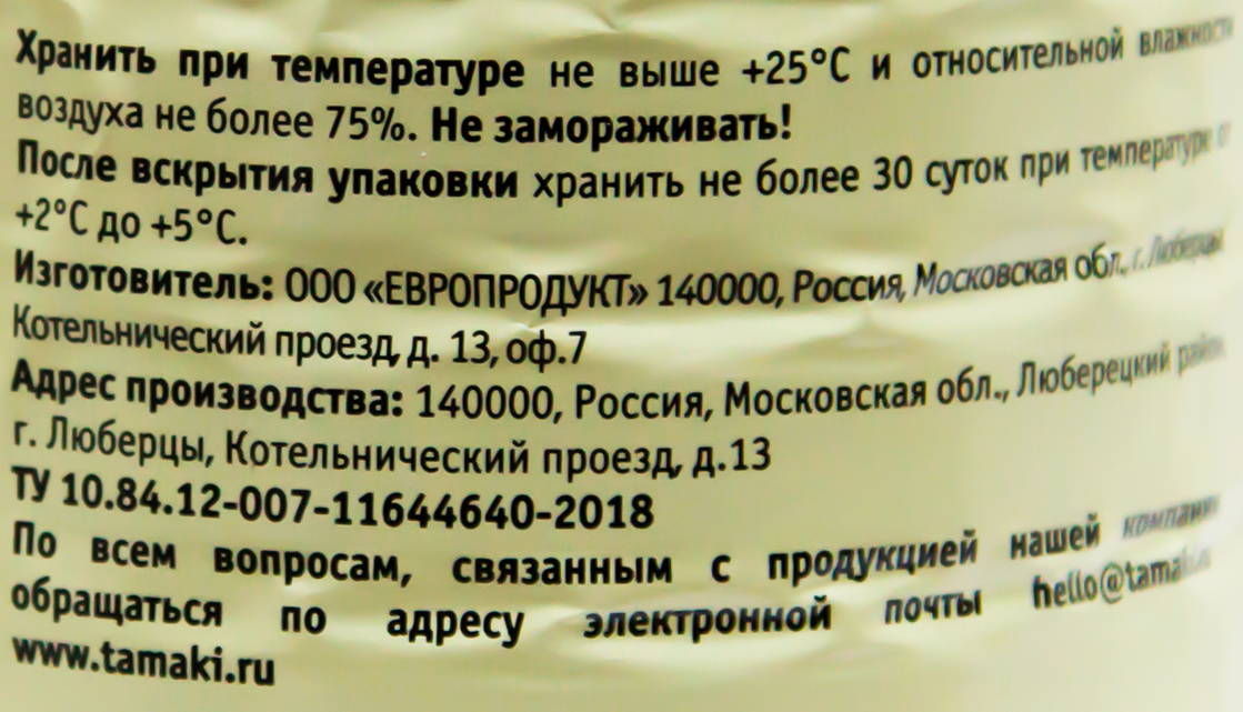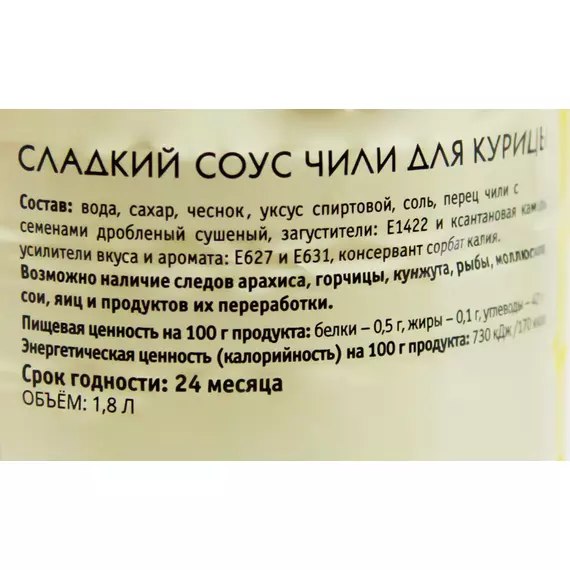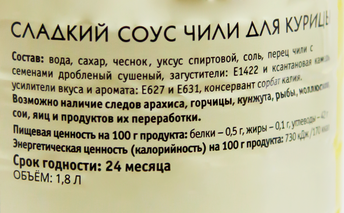 вода, сахар, чеснок, уксус спиртовой, соль, перец чили с семенами дробленый сушеный, загустители: E1422 и ксантановая камедь, усилители вкуса и аромата: E627 и E631, консервант сорбат калия