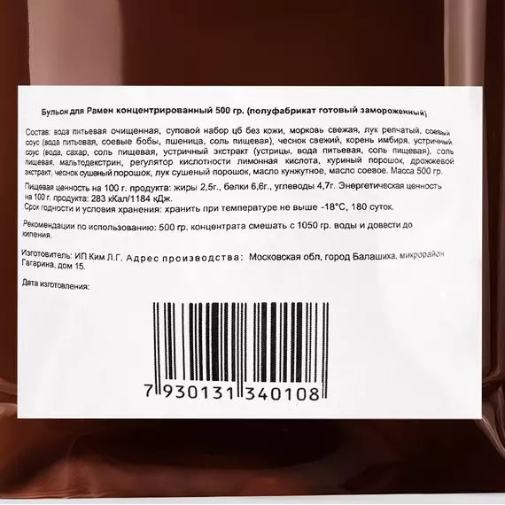 вода питьевая очищенная, суповой набор цб без кожи, морковь свежая, лук репчатый, соевый соус (вода питьевая, соевые бобы, пшеница, соль пищевая), чеснок свежий, корень имбиря, устричный соус (вода, сахар, соль пищевая, экстракт устриц (устрицы, вода питьевая, соль пищевая), соль пищевая, мальтодекстрин, регулятор кислотности лимонная кислота, куриный порошок, дрожжевой экстракт, чеснок сушеный порошок, масло кунжутное, масло соевое.