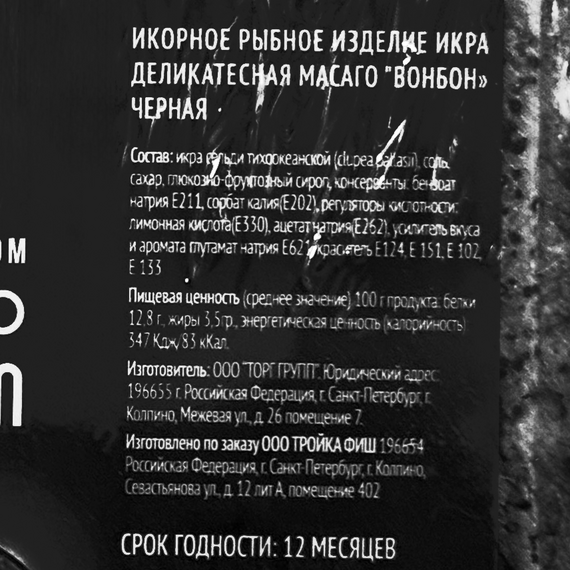 икра сельди тихоокеанской, соль, сахар, глюкозно-фруктозный сироп, консервант: бензоат натрия E211, сорбат калия E202, регуляторы кислотности: лимонная кислота E330, ацетат натрия E262, усилитель вкуса и аромата глутамат натрия E621, краситель E124, E151, E102, E133.