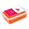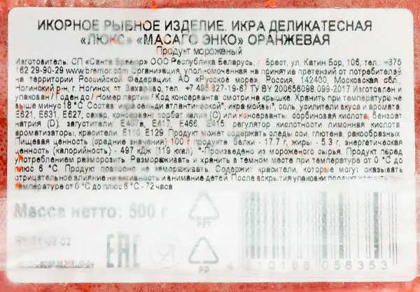 икра сельди атлантической, икра мойвы, соль, усилители вкуса и аромата: E621, E631, E627; сахар, консервант сорбат калия ил консерванты сорбиновая кислота, бензоат натрия, загустители E407a, E417, E466, E415; регулятор кислотности лимонная кислота, ароматизаторы, красители E110, E129. Продукт может содержать следы глютена, сои, ракообразных.