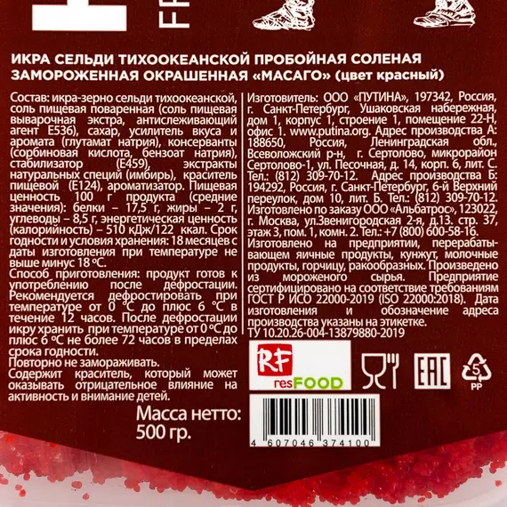 икра-зерно сельди тиххокеанской, соль пищевая поваренная (соль выварочная экстра, антислеживающий агент E536), сахар, усилитель вкуса и аромата (глутамат натрия), консерванты (сорбиновая кислота, бензоат натрия), стабилизатор E459, экстракты натуральных специй (имбирь), краситель пищевой E124, ароматизатор