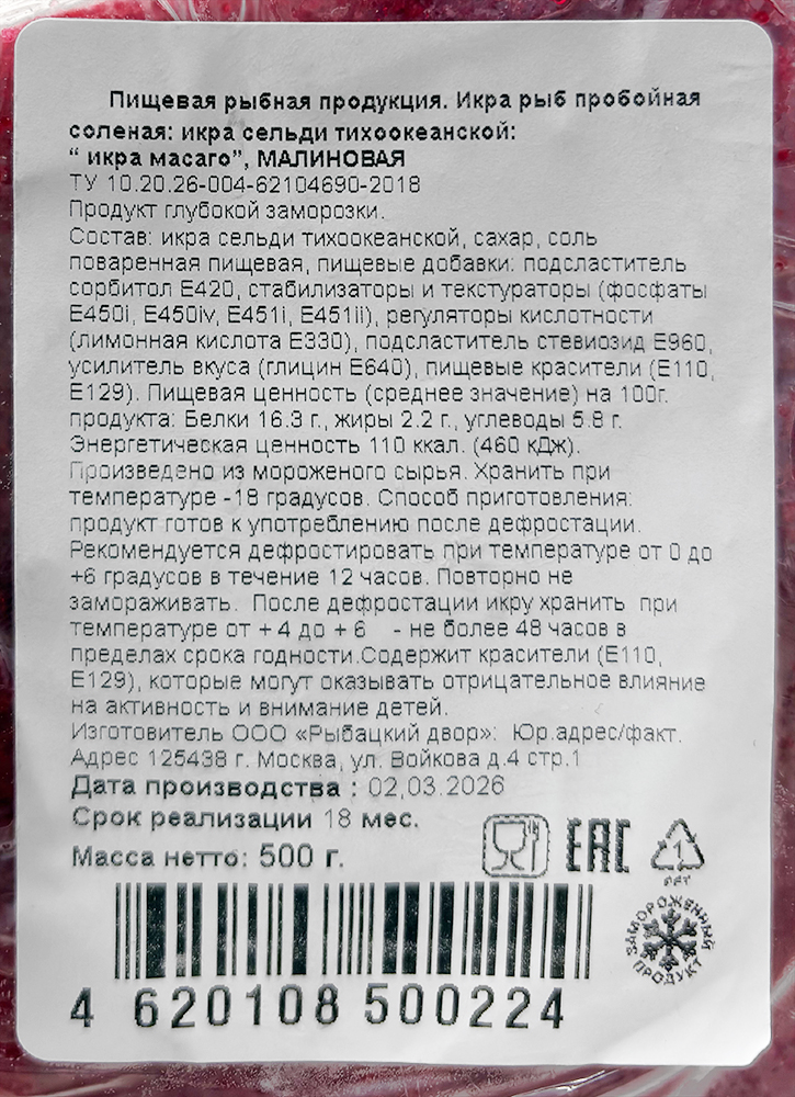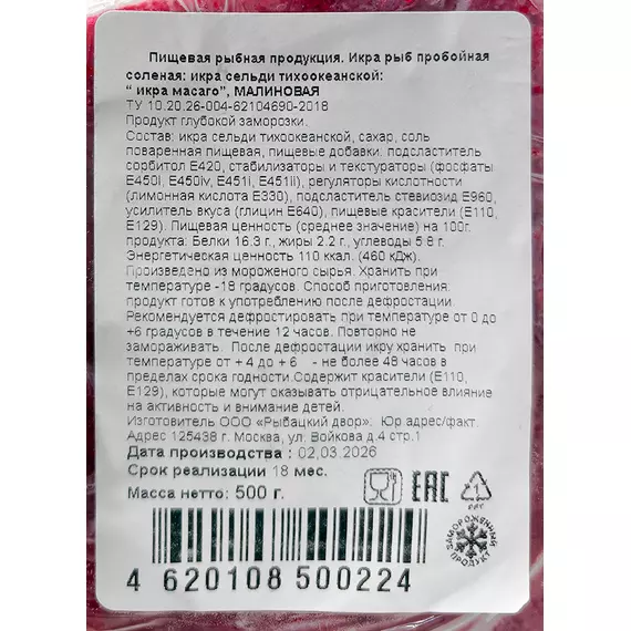 Икра сельди тихоокеанской, сахар, соль поваренная пищевая, пищевые добавки: подсластитель сорбитол E420, стабилизаторы и текстураторы (фосфаты E450i, E450iv, E451i, E451ii), регуляторы кислотности (лимонная кислота E330), подсластитель стевиозид E960, усилитель вкуса (глицин E640), пищевые красители (E110, E129).
