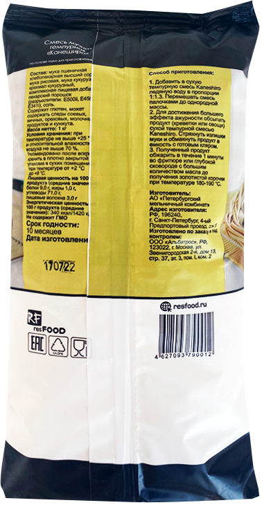 Темпурная смесь Канеширо используется для приготовления креветок, морепродуктов, мяса и овощей. При обжарке темпурная смесь покрывает продукты воздушной хрустящей корочкой, сохраняя сочность ингредиентов. При обжарке не пригорает, не впитывает лишнее масло. Что-бы добиться таких характеристик используется несколько видов муки.