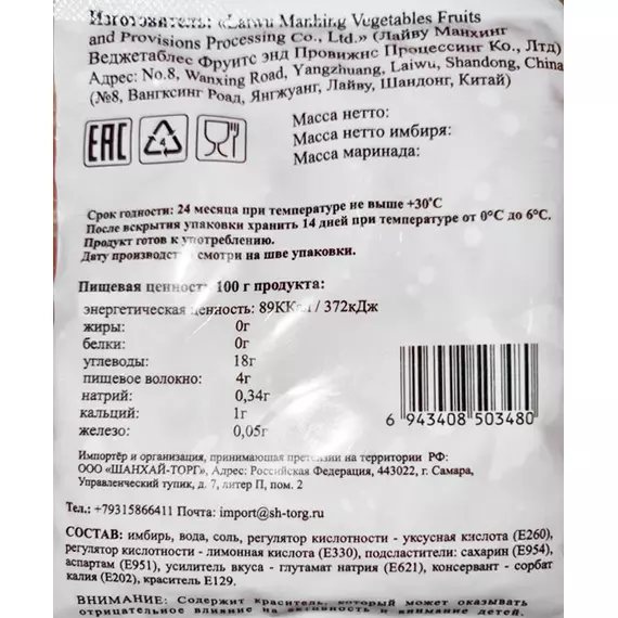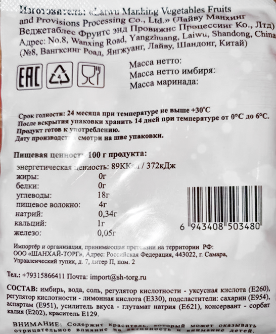 имбирь, вода, соль, регуляторы кислотности: уксусная, лимонная кислота, подсластители: сахарин, аспартам, усилитель вкуса глутамат натрия, консервант сорбат калия, краситель красный очаровательный